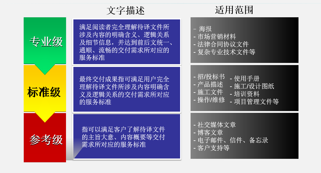 笔译翻译通常分为三个标准:参考级、标准级、专业级。