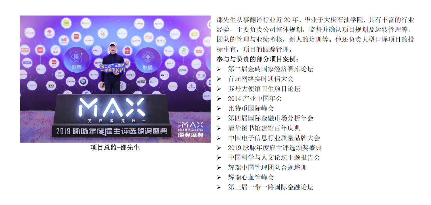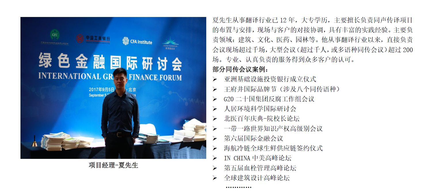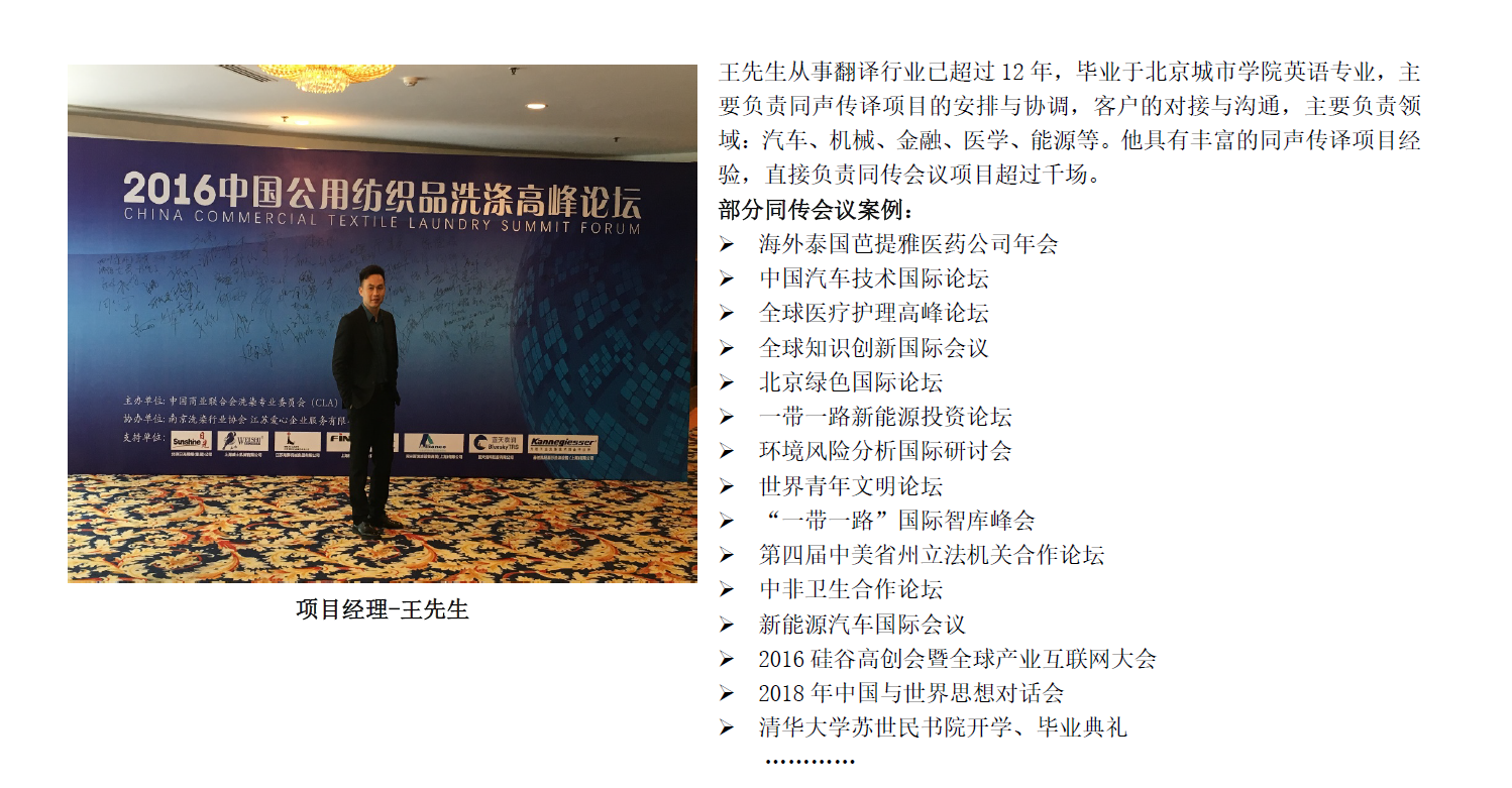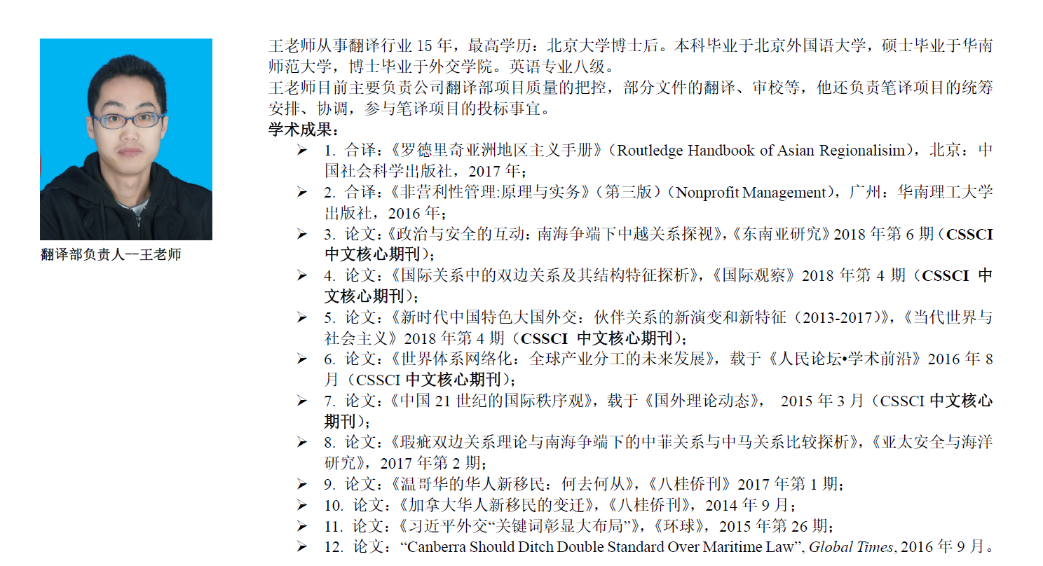北京九鼎天下文化有限公司是一家成立于首都北京的专业翻译公司。为广大客户提供口译、笔译等翻译服务。口译包括:同声传译、同传设备租赁、交替传译、商务口译等翻译服务。签约同传译员近百人,主要来自英国巴斯、美国蒙特雷、上外高翻、英国纽斯卡尔、北外高翻、对外经济贸易大学等,近千场同传会议经验。笔译在多个行业、多个语种上,都有丰富的项目处理经验,同时拥有数十名的专职译员,这些专业的服务团队可保证客户笔译项目服务输出的高效性和稳定性。同时,根据客户公司内部的需求及客户项目拓展不同阶段的差异化需求,九鼎翻译还可提供如笔译专业审校、笔译译员现场派驻以及笔译译员培训等相关的产品和服务,全面满足客户的整体笔译服务需求。